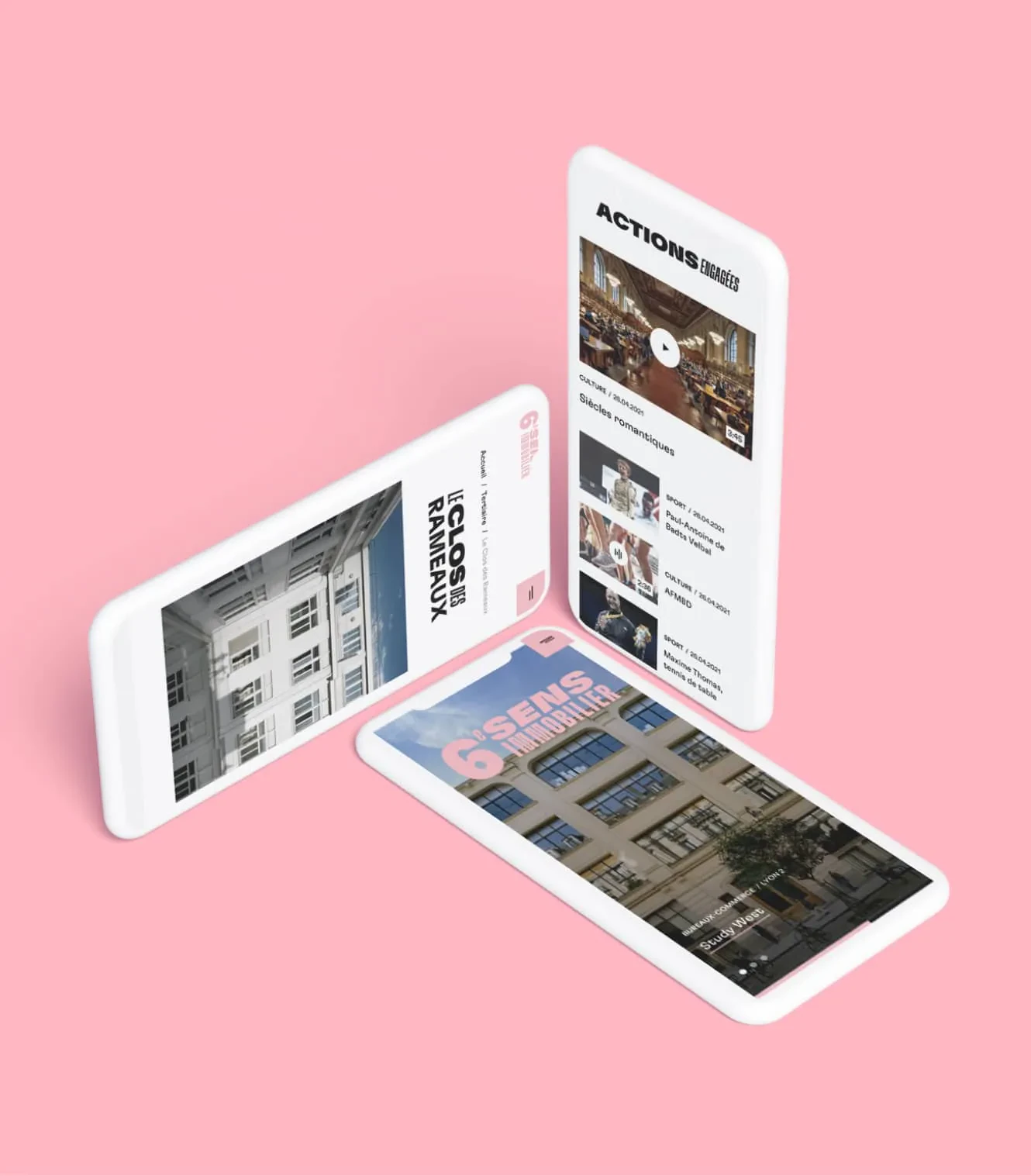 Comme pour l’identité, on se base sur un principe destiné à marquer en profondeur l’esprit des utilisateurs : ayant vocation à présenter les offres immobilières comme les prises de paroles de 6e Sens Immobilier, le site est pensé dans sa mise en forme comme un média à part entière.