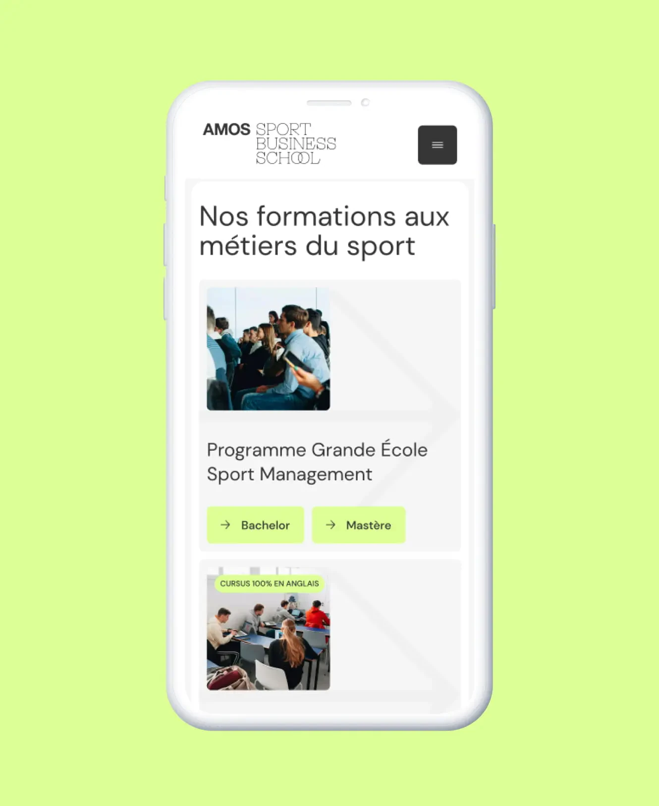 La promesse d’Amos est que le sport ne soit pas simplement une passion de loisirs mais soit le cœur d’un métier. Il est donc indispensable d’amplifier l’aspect inspirationnel du site d’Amos, pour que la “gen Z – cible principale des cursus proposés – ait envie de rejoindre les bancs de l’école de commerce. Nous conservons les photographies plein écran, de sportifs ou d’étudiants, auxquels nous ajoutons des punchlines pour renforcer les messages d’Amos.
