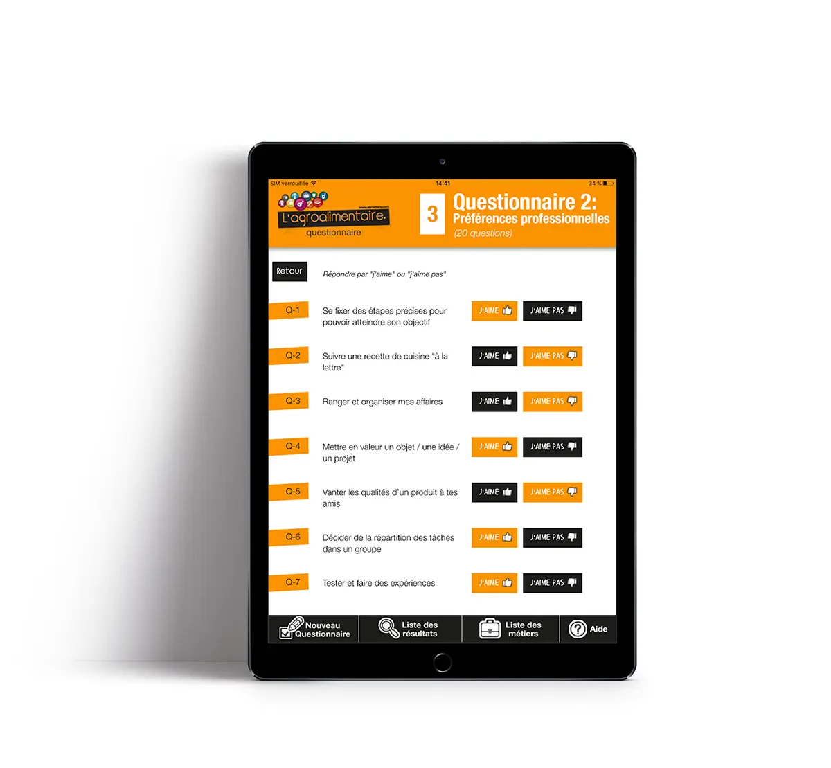 L'application alimaton a pour but de sensibiliser les jeunes aux emplois de la filière alimentaire en leur présentant les métiers qui leur correspondent. Elle fonctionne de façon autonome, sans connexion, de la manière suivante :