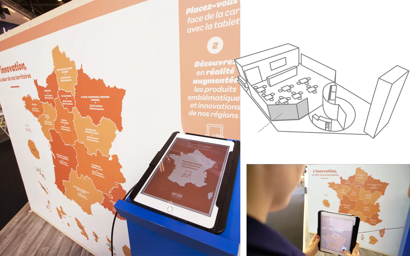 Ce projet événementiel fut l’occasion pour l’agence de déployer l’eventail de ses compétences: la conception spatiale du stand, une zone proposant une expérience de réalité augmentée, des écrans diffusant des animations motion design, des infographies et même des supports de communication imprimés.