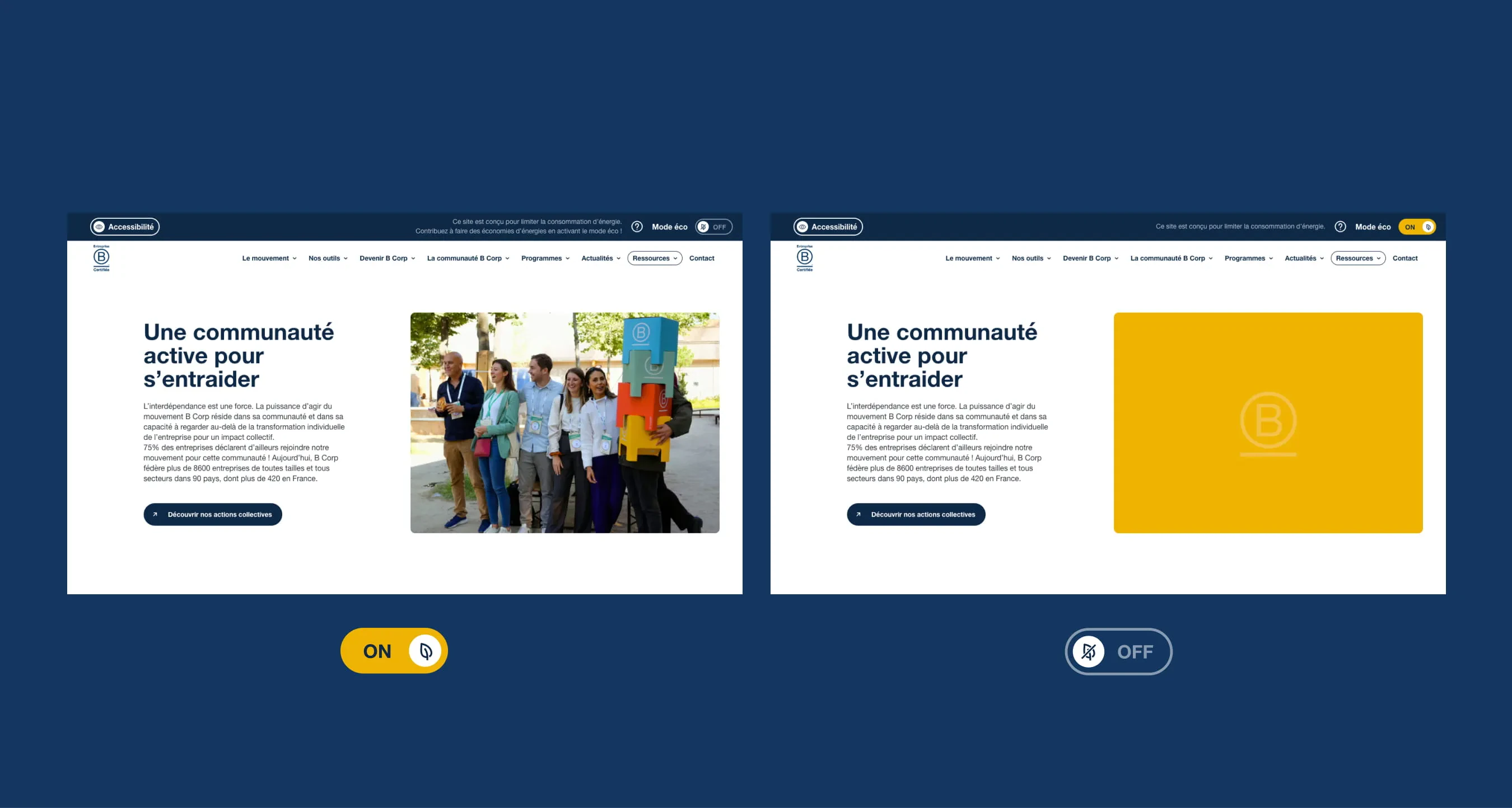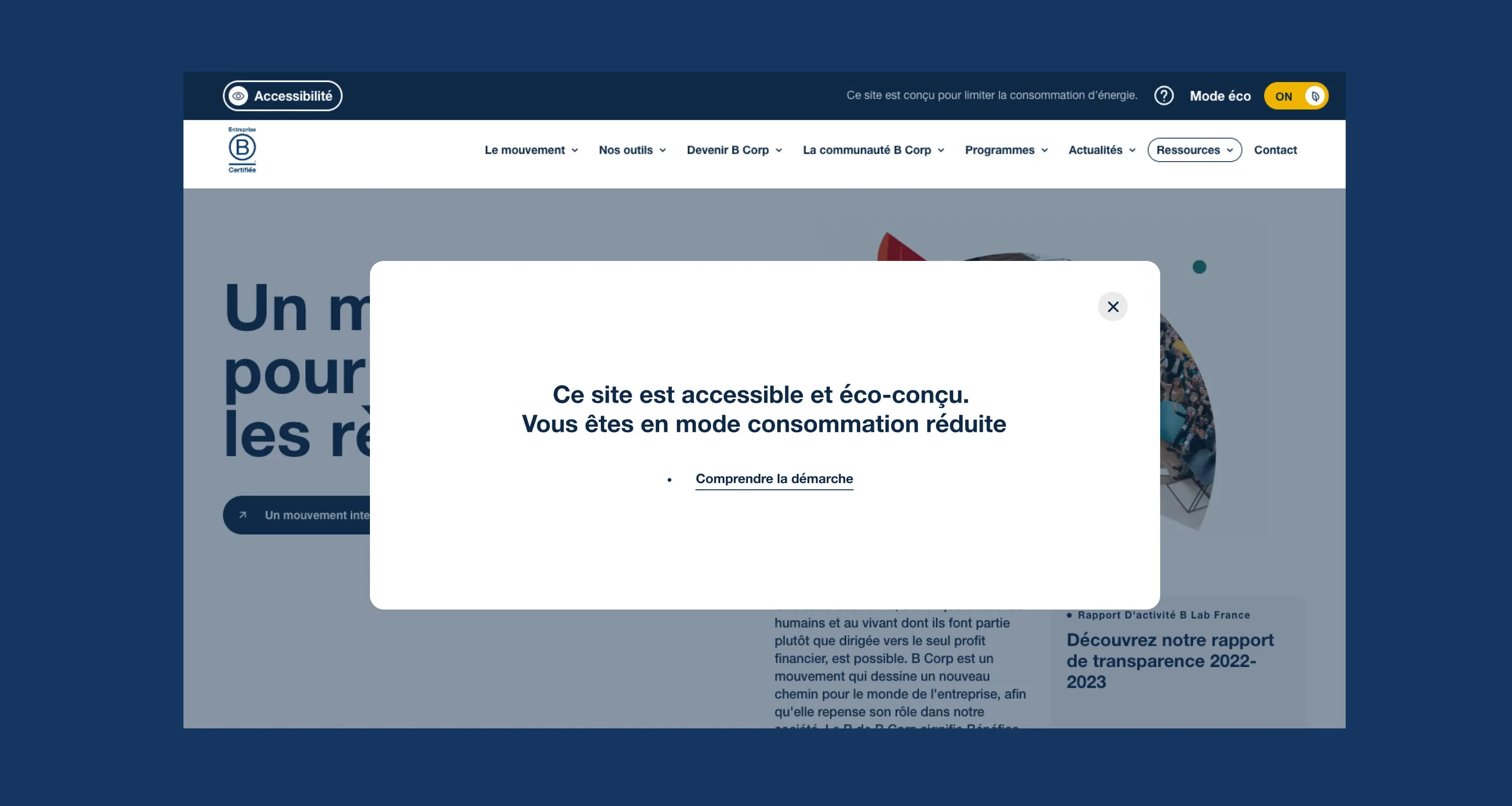 Nous avions déjà collaboré à la première refonte de leur site, en 2021. Le mouvement a pris de l’ampleur, il était nécessaire de procéder à une nouvelle refonte qui aligne la communication digitale de B Lab France avec la nouvelle envergure de l’association et avec ses engagements. Des engagements qui sont dans l’ADN de 148 Agence Collective, labellisée B Corp depuis 2017, et experte de l’éco-conception de sites web. Nous avons ainsi écoconçu et réalisé la nouvelle version du site de B Lab France.