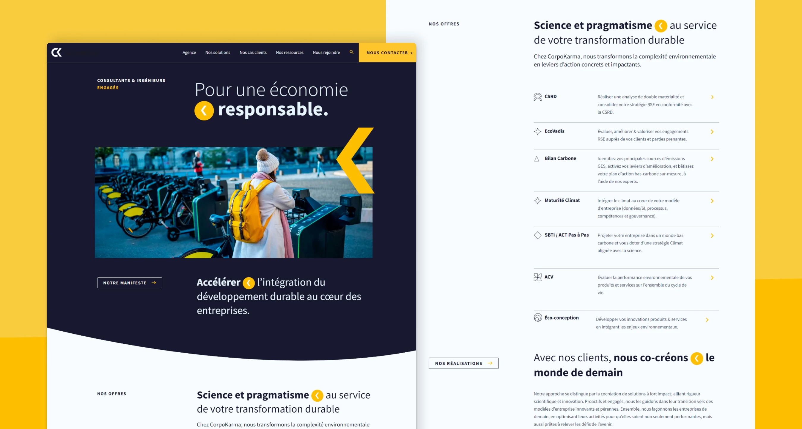 Notre équipe créa a su proposer pour la refonte de l’identité digitale de Corpokarma une esthétique moderne et éco-conçue, fidèle aux couleurs de la marque et parfaitement adaptable à tous types de contenus. Le design repose sur des aplats de couleurs déjà présentes dans la charte graphique de la marque, la réutilisation du chevron (élément central du logo de Corpokarma) comme code graphique ; le motif de la vague vient structurer et animer les pages. Enfin, l’usage de pictogrammes géométriques créés sur-mesure prend le pas sur l’image, pour mieux répondre aux attentes de l’éco-conception. Cette identité visuelle, claire et réutilisable, assure une cohérence forte tout en réduisant l'empreinte carbone du site.
