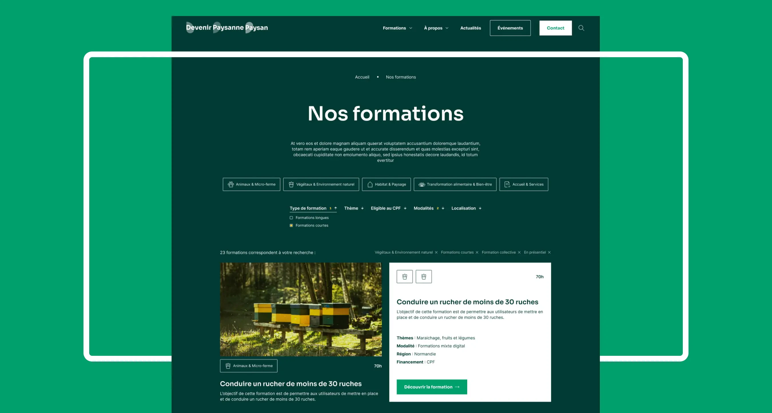 Nous nous sommes ensuite concentrés sur les parcours et l’architecture des contenus : deux parcours principaux (Je veux découvrir / Je veux m’installer) guident l'utilisateur tout au long de son expérience de visite vers deux grands types de formations correspondantes (Formations courtes / Formations longues), réunies dans un seul catalogue. Tout se joue ensuite dans un système de filtres et de tris de ce catalogue : les grandes thématiques de la terre et du vivant, puis les sous-thématiques plus resserrées, les modalités et la localisation.