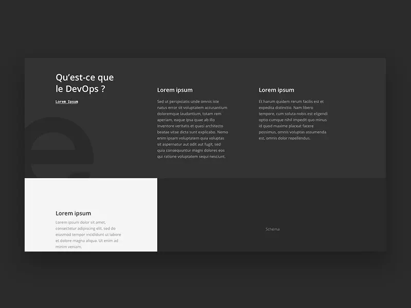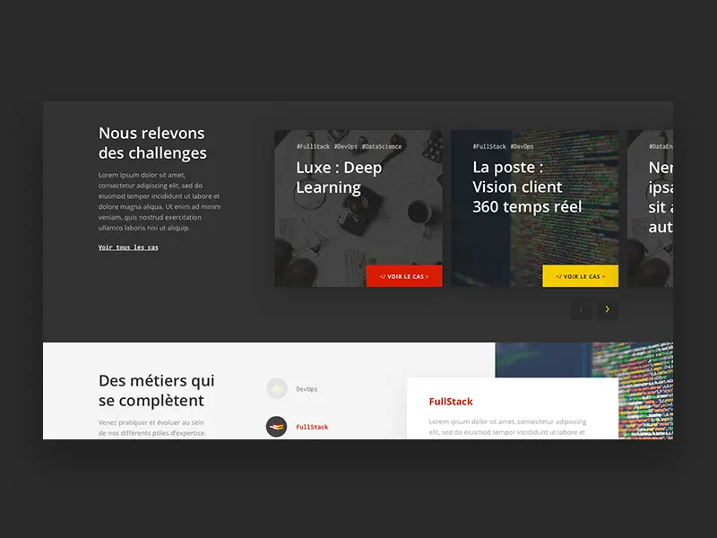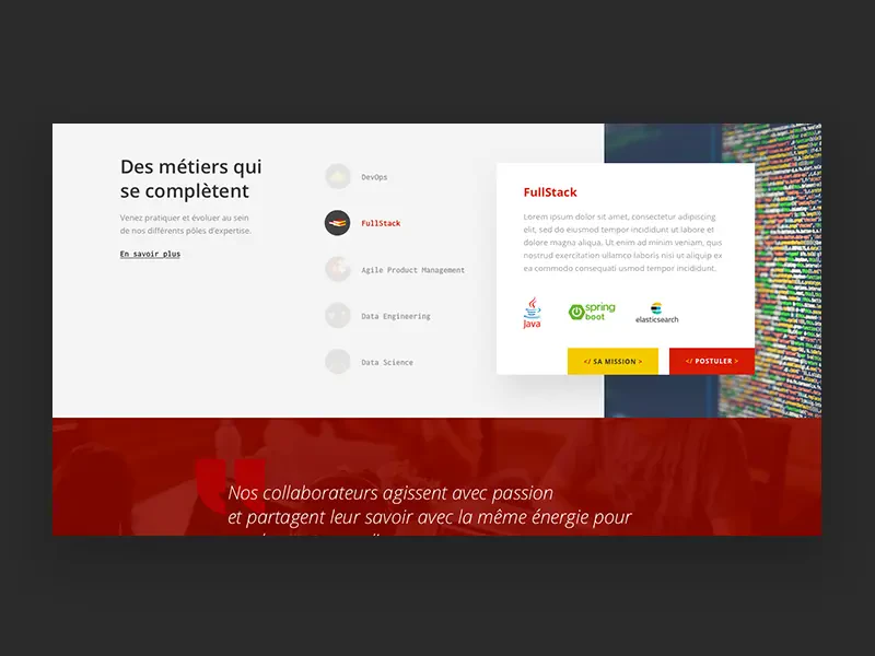D’une manière générale l’ensemble du site s’inspire de l’interface du célèbre logiciel de coding Sublim Text, familier aux consultants d’Ebiznext. En reprenant l’univers du développement numérique avec des arrière-plans sombres, des textes écrits à la manière des balises nous avons fait des ces éléments un code graphique. En effet, Ebiznext n’ayant pas de charte graphique, nous en avons conçu une au fur et à mesure de la création du site. Nous avons choisi d’avoir recours à la couleur rouge, présente dans le logo, à laquelle nous avons ajouté le jaune pour créer un contraste franc de couleurs vives. L’alternance de ces deux couleurs, notamment parmi les boutons d’action, permet d’apporter du dynamisme ainsi que des repères de navigation.