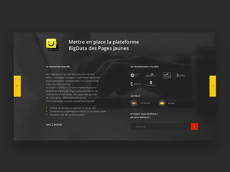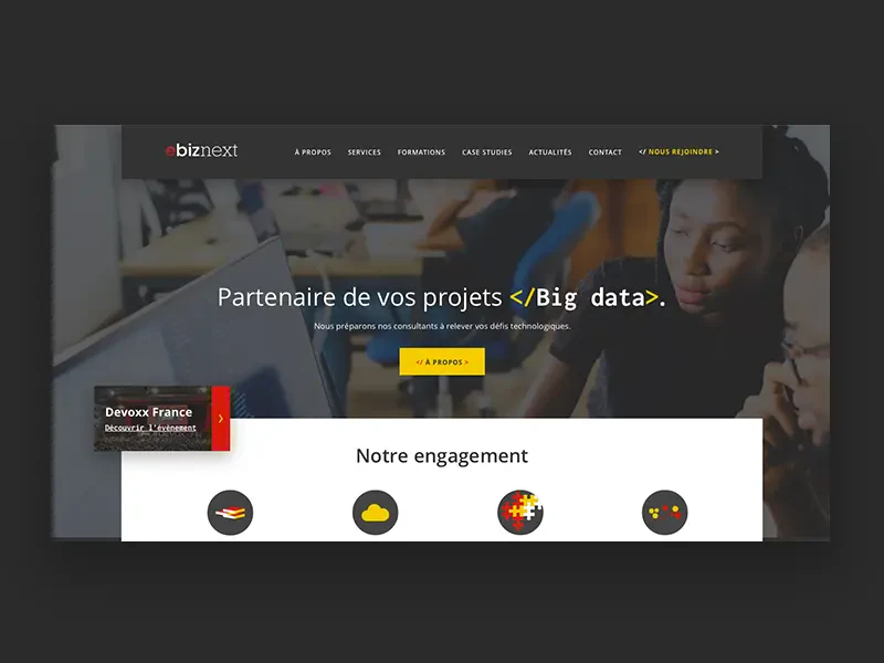 Ebiznext a souhaité se démarquer de ses nombreux concurrents : nous leur avons conseillé de mettre en avant l’une de leurs qualités : la pédagogie. En effet, Ebiznext propose de nombreuses formations, souvent structurées autour de cas clients. Il nous a paru intéressant de se servir de ces contenus pour les intégrer au sein du site. Ainsi chaque étude de cas permet de démontrer diverses expertises de l’entreprise, un attractivité double tant auprès de potentiels clients, qu’auprès de nouveaux consultants tentés d’intégrer Ebiznext.