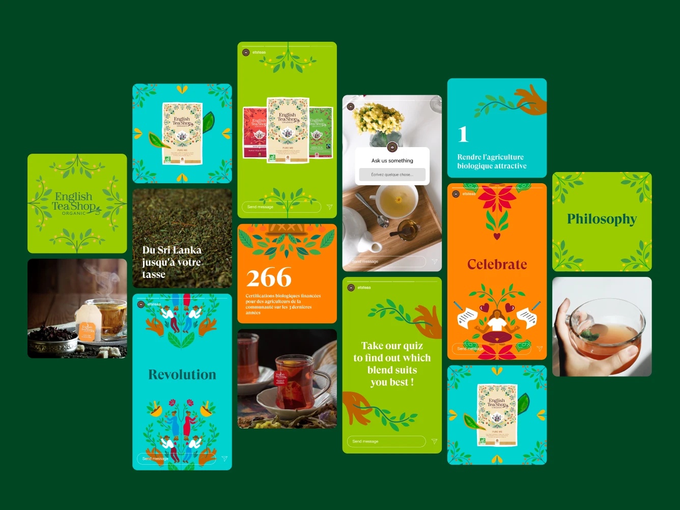 Pour commencer, on planche sur une stratégie définissant la tonalité à adopter et établissant un calendrier éditorial sur plusieurs mois. On imagine de nombreuses typologies de posts pour assurer la production de contenus pertinents et diversifiés : jeux-concours, histoires d’agriculteurs, avis clients, chiffres-clés, anecdotes sur l’aventure English Tea Shop… Des templates associés à chaque type de contenu sont également produits, de manière à garantir une totale autonomie des équipes de community management.