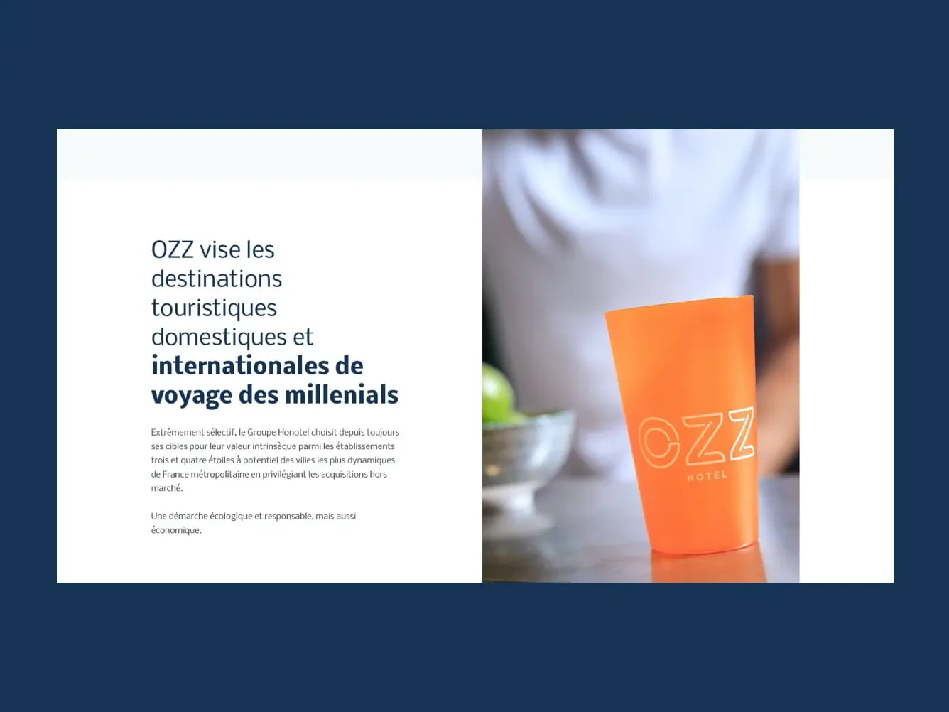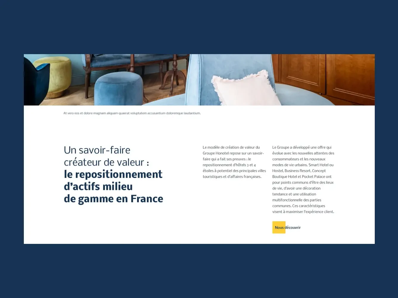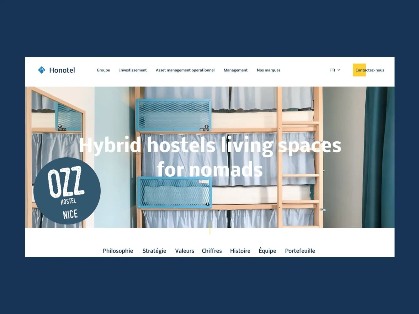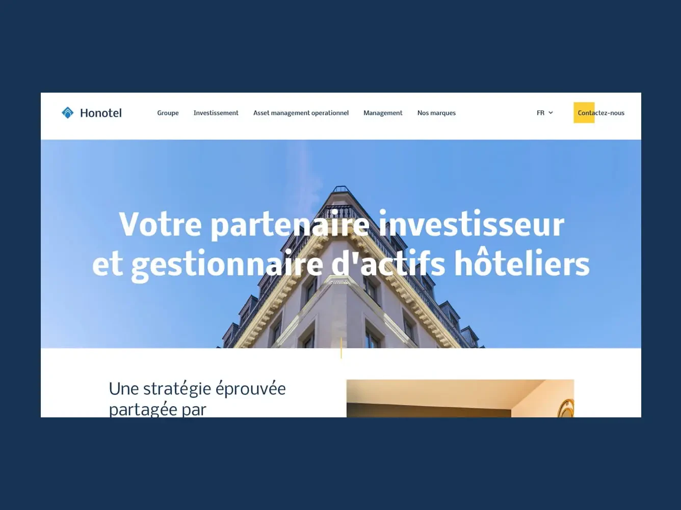 Honotel est un client de longue date. C’est un groupe d’investissement hôtelier pour qui on a créé le site Happyculture.com, une plateforme grand public de réservation d’hôtels. Cette fois, Honotel fait appel à nous pour son site institutionnel, avec un cahier des charges très différent. Alors que pour Happyculture.com l’objectif était de créer un univers unique, qui donne envie de partir en vacances, pour Honotel.com il s’agit de concevoir un site institutionnel permettant d’attirer de nouveaux investisseurs. L’enjeu de la crédibilité est donc primordial. Celui de la modernité aussi. Ce site doit être la vitrine de marque d’une société de gestion d’actifs qui maîtrise le marché de l’investissement hôtelier et qui propose des offres de placements performants.