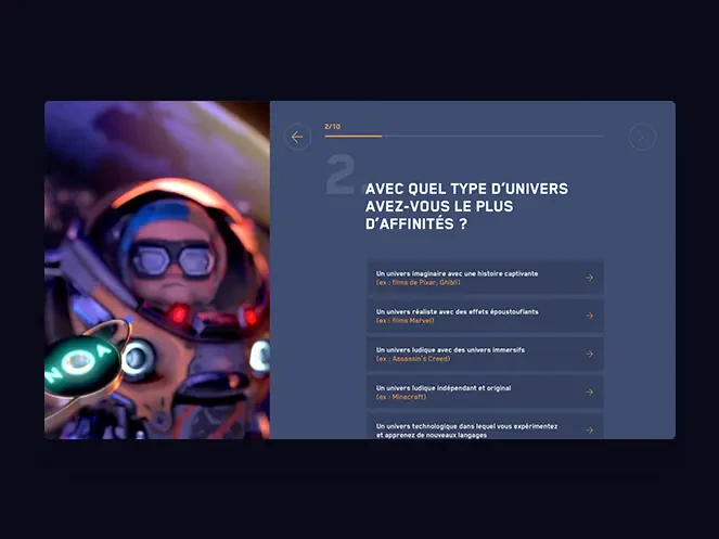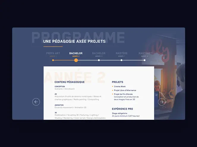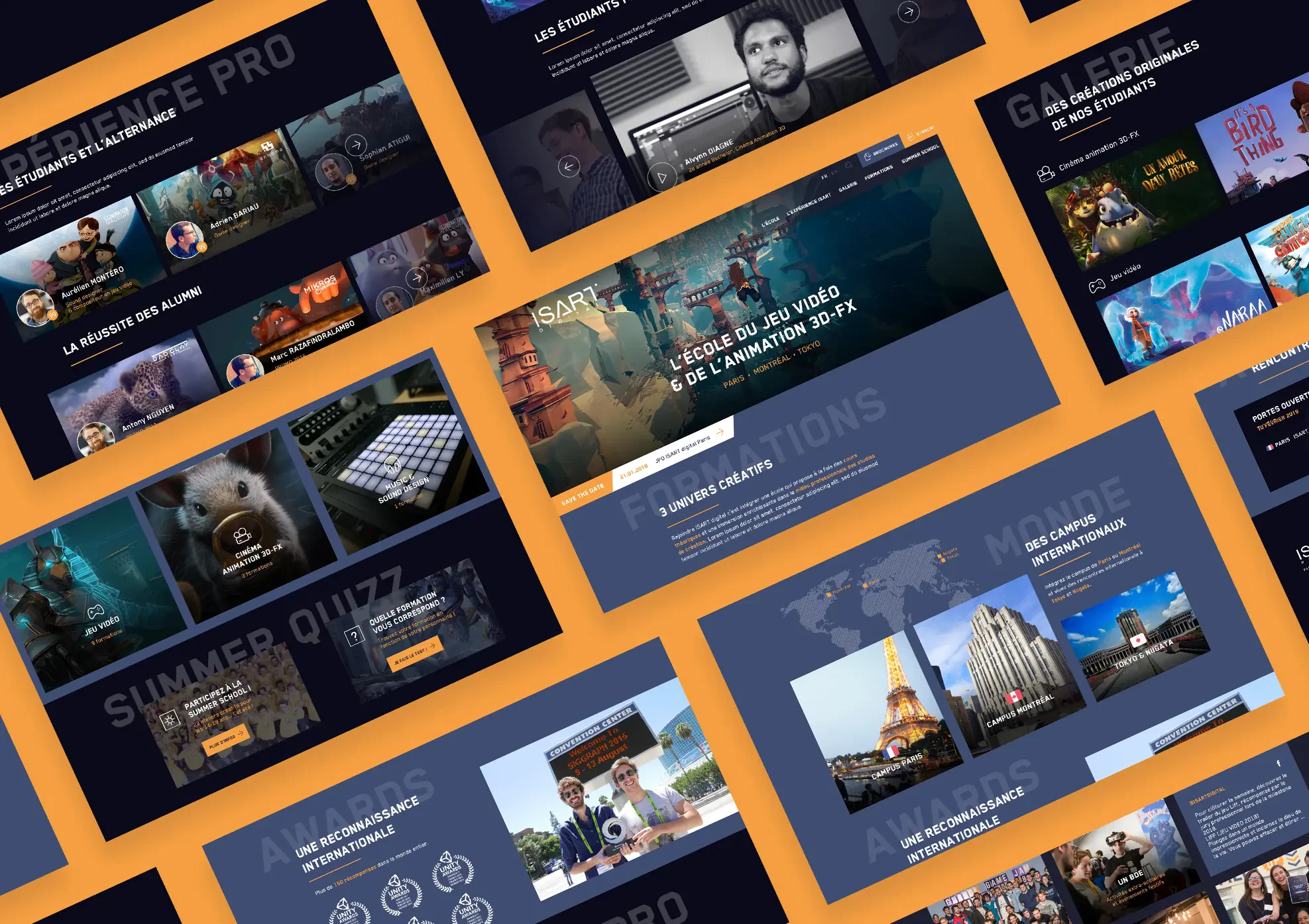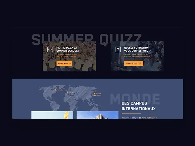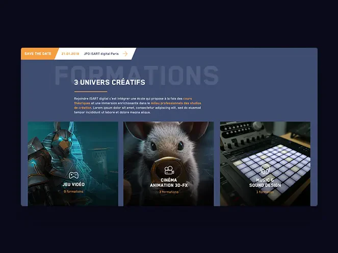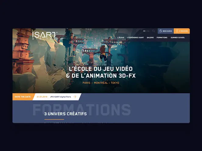 Isart Digital, c’est une école internationale qui forme aux métiers du jeu vidéo, de l’animation 3D et des effets spéciaux numériques. Elle propose des formations jusqu’à Bac+5 et des stages d’été pour les 14-18 ans. L’objectif principal du site Internet de l’école est donc de s’adresser aux jeunes et de leur donner envie de s’inscrire. Nos créatifs ont donc imaginé un univers graphique reprenant les codes du jeu vidéo avec des personnages qui évoluent dans des décors fantastiques appréciés des utilisateurs de la Xbox, de la Playstation et de la Nintendo. Le site laisse une grande part à l’image. Le résultat est très visuel grâce aux nombreux sliders présents sur chaque page. Nous devions aussi parler aux prescripteurs, les parents et les professeurs, et la maquette du site a été pensée pour être très informative avec des onglets précisant les différents types de formation, leur déroulé et les modalités d’admission.