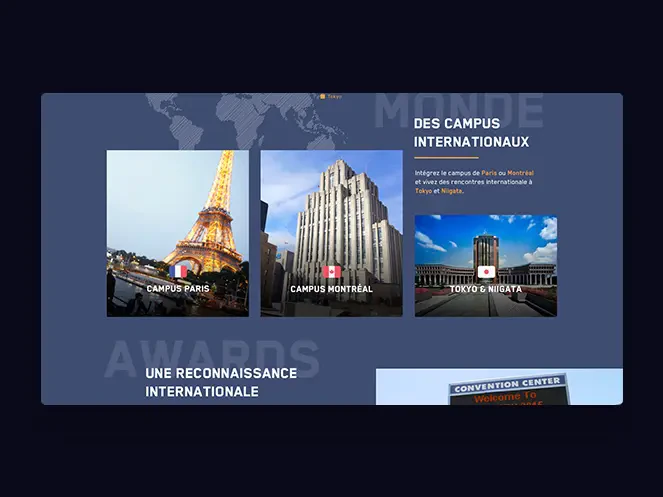 Isart Digital ambitionne de devenir l’un des leaders internationaux dans son domaine. L’école possède trois sites, à Paris, à Montréal et à Tokyo. Un onglet visible sur la page d’accueil permet de basculer l’intégralité du site en anglais. Isart Digital nous a également demandé de mettre en valeur les projets réalisés par l’ensemble de ses étudiants sur les trois campus. On a donc créé une page Galerie reprenant plus de 200 projets sur le modèle de Netflix, de manière à donner envie de cliquer sur ces vidéos et de visionner un maximum de projets. Le client avait déjà quelques idées sur ce qu’il voulait. Afin de bien les comprendre et de pouvoir le conseiller au mieux nous avons fait un atelier UX d’une demi-journée. Ensemble, nous avons mis sur des post-it tout ce qui devait apparaître sur le site, en termes de contenu et de valeurs. Il y a eu un gros travail de co-construction du site avec le client.