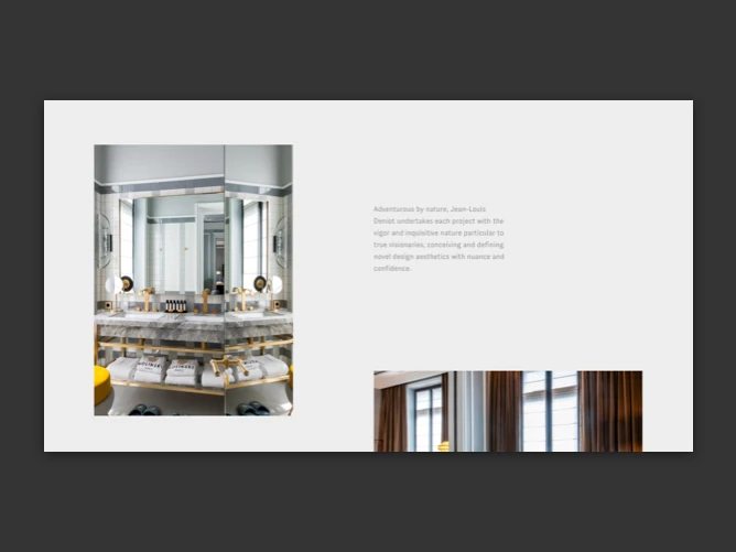 Jean-Louis Deniot est l’un des plus grands architectes d’intérieur de notre époque. Présent dans le Top 100 AD des architectes et designers, il a l’art de créer des atmosphères, de mélanger les matériaux et les textures. Ses palettes de couleurs sont subtiles. Son éclairage toujours impeccable. Afin de mettre en valeur ses intérieurs emblématiques, Jean-Louis Deniot souhaite refondre son site Internet. Le cahier des charges est simple mais immensément exigeant : ce site doit être un prolongement de son travail. Proposer une expérience de navigation qui immerge l’internaute dans l’univers créatif du designer.