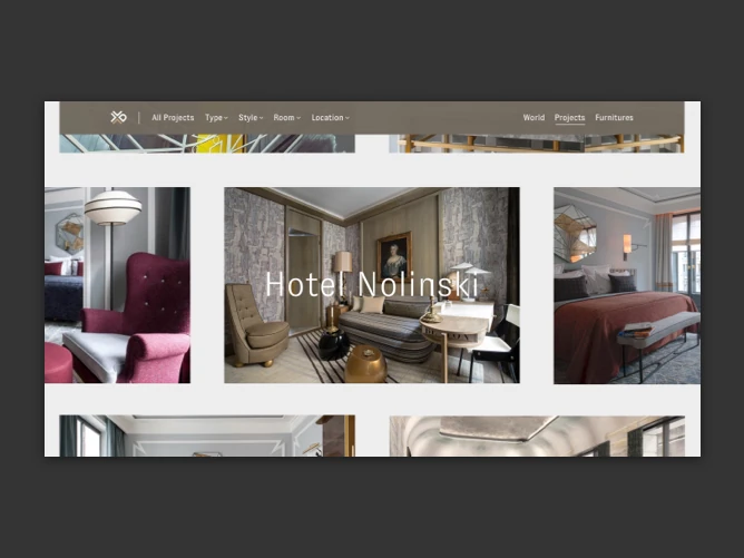 Un site dont l’impact environnemental est réduit ne veut pas dire un site sans créativité artistique. Bien au contraire. Et le site de Jean-Louis Deniot en est la preuve. C’est même la priorité du client : que son site soit beau. Les projets de Jean-Louis Deniot sont toujours très lumineux et Gaétan, notre directeur de création, souhaite mettre en valeur cette lumière. Quand on arrive sur la page d’accueil et qu’on scrolle on a l’impression d’une fenêtre qui s’ouvre sur l’univers créatif de Jean-Louis Deniot. On joue aussi avec les palettes de couleur : sur certaines pages, la couleur de fond est la couleur moyenne des images de la page. Enfin, grâce à des modes de fusion, certaines typographies sont incrustées dans les visuels pour donner la priorité à la couleur de l’image et ainsi accentuer la mise en valeur de la lumière.