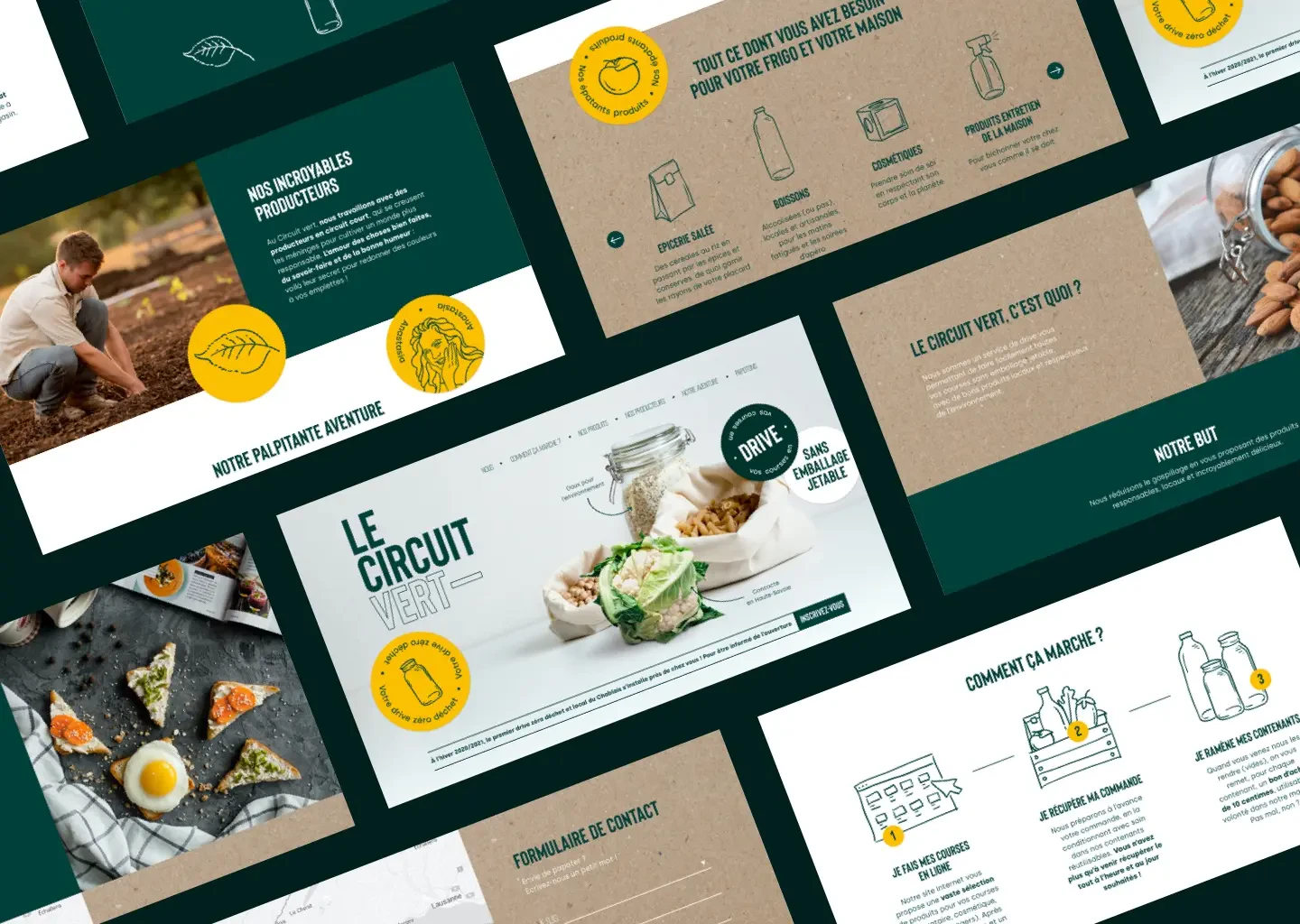 Avant l’ouverture de son drive, Anastasia a besoin d’un premier site Internet pour donner vie à sa start-up et crédibiliser son projet, à la fois auprès des producteurs locaux pour leur donner envie de rejoindre l’aventure et auprès des futurs clients. Ce site raconte l’histoire du projet, affiche ses valeurs et permet de découvrir l’univers de marque du Circuit Vert. On lui remet également une charte éditoriale, qui permet d’assurer une cohérence de fond et de forme, pour le site actuel et pour les publications futures.