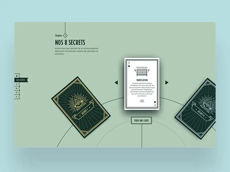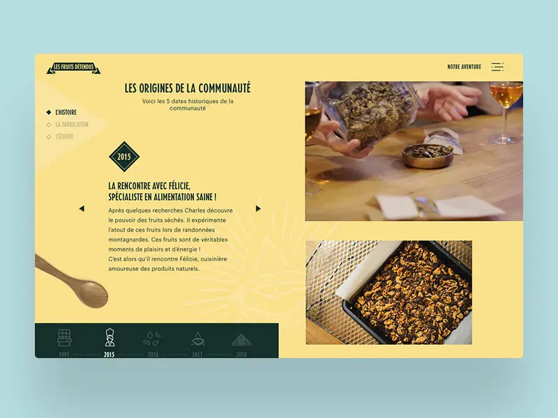 L’une des volontés communes entre les équipes des Fruits Détendus et de l’agence 148 était de produire un site dynamique, interactif au design décalé construit autour de chapitres telles de petites expériences graphiques et ludiques. L’équipe créative de l’agence en charge du design a travaillé main dans la main avec l’équipe technique de 148 en charge des animations comme du développement afin de garantir une création à la hauteur des exigences de chacun. Le résultat est une succession de modules originaux chacun conçu autour d’un message en particulier qui est traduit graphiquement et techniquement de manière unique. Le design général quant à lui est fortement inspiré de celui des packagings, à savoir un ensemble de formes géométriques, de larges aplats de couleurs parsemés de détails culinaires.