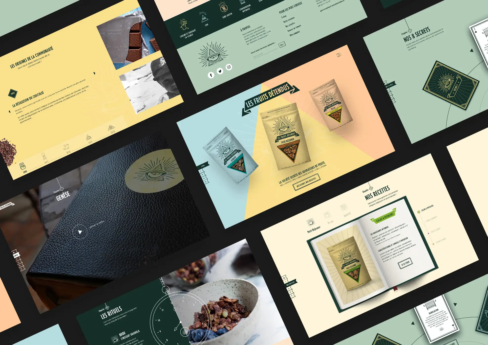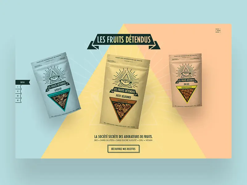 Les Fruits Détendus est une jeune marque d’en-cas bio, vegan, composés de fruits séchés construite autour de valeurs telle celle de bien se nourrir sans se prendre au sérieux. Son univers graphique s’inspire de celui des sociétés secrètes. Cette dimension ésotérique accentue la dimension militante de l’équipe des Fruits Détendus envers la nourriture saine et équilibrée. En effet, partant du constat que le secteur des en-cas sucrés ou salés est généralement constitué de produits trop gras et rarement bio ou vegan, la marque a souhaité sortir son épingle du jeu avec un positionnement dans l’ère du temps. C’est ainsi qu’un univers original a été conçu permettant de fédérer toute une communauté autour de la gourmandise, des bons produits et de la sympathie.