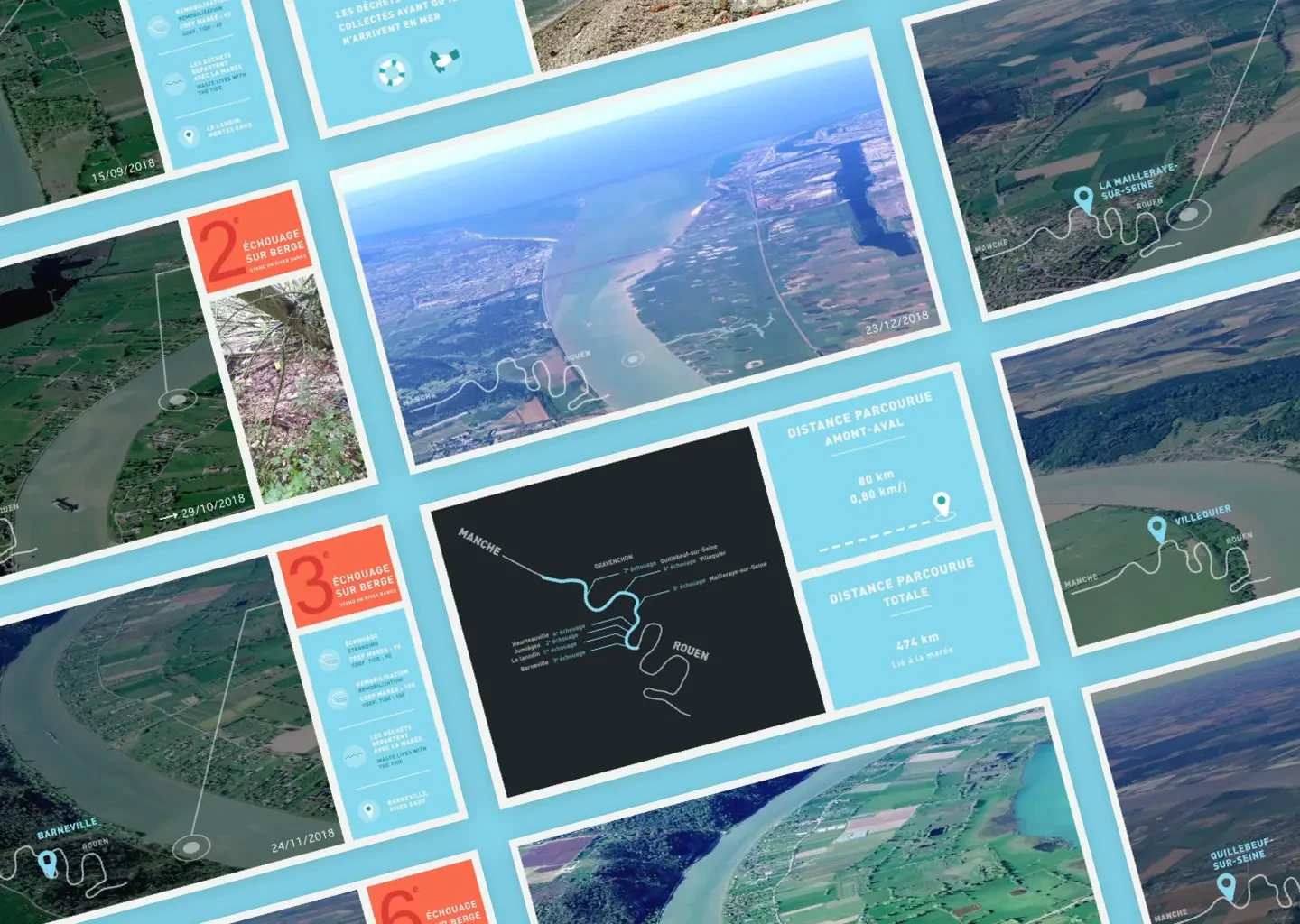 Le projet MacroPLAST a pour but de mesurer les flux de macrodéchets en plastique (bouteilles, emballages, sacs, etc.) qui s’écoulent dans la Seine et vont se déverser dans la mer. L’Université Paris Est – Créteil a participé à cette étude en installant des balises GPS sur certains déchets. À partir des données récoltées, l’agence 148 a produit une vidéo qui permet de retracer leur trajet depuis Rouen jusqu’à l’estuaire.
