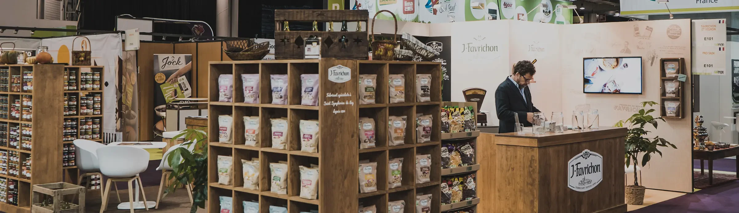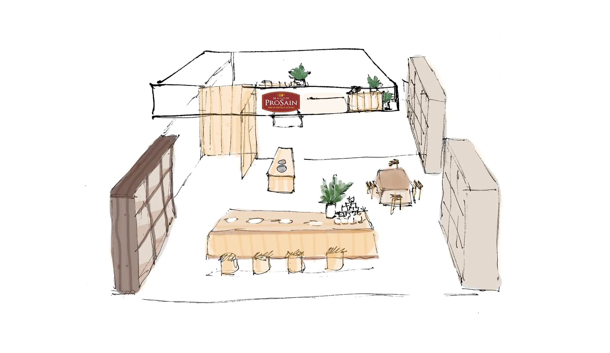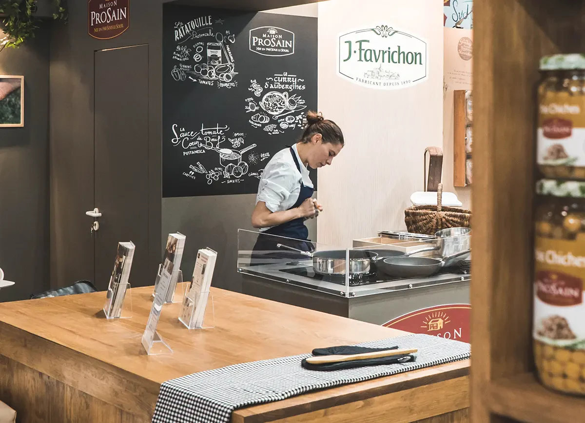 C'est ainsi que la zone Favrichon s’inspire de l’univers de l’épicerie tandis que la zone ProSain fait davantage référence aux codes d’une cuisine que l’on pourrait retrouver chez soi. C’est pourquoi l’équipe créative de l’agence propose tout d’abord des planches d’inspiration (moodboards) puis de nombreux crayonnés ainsi que plusieurs mises en situation en 3D pour finir. Ces étapes sont nécessaires au bon déroulement du projet autant pour le client que pour le standiste de l’agence 148.
