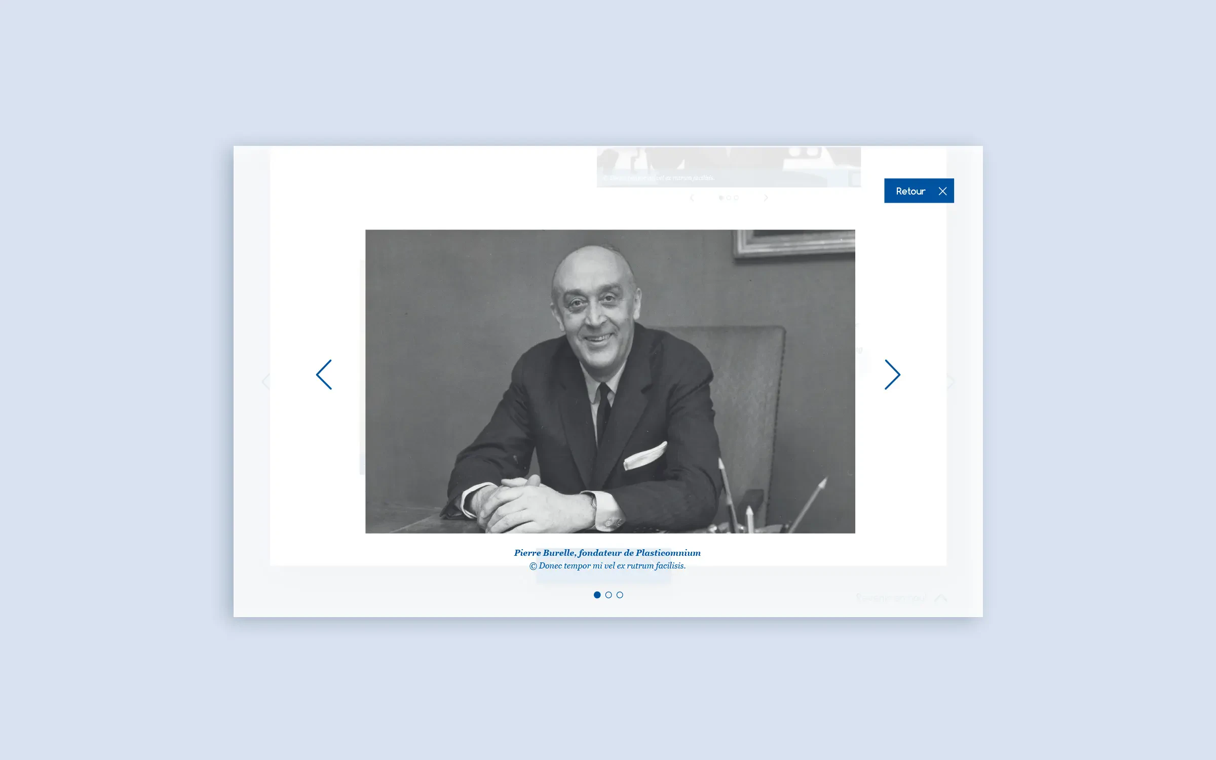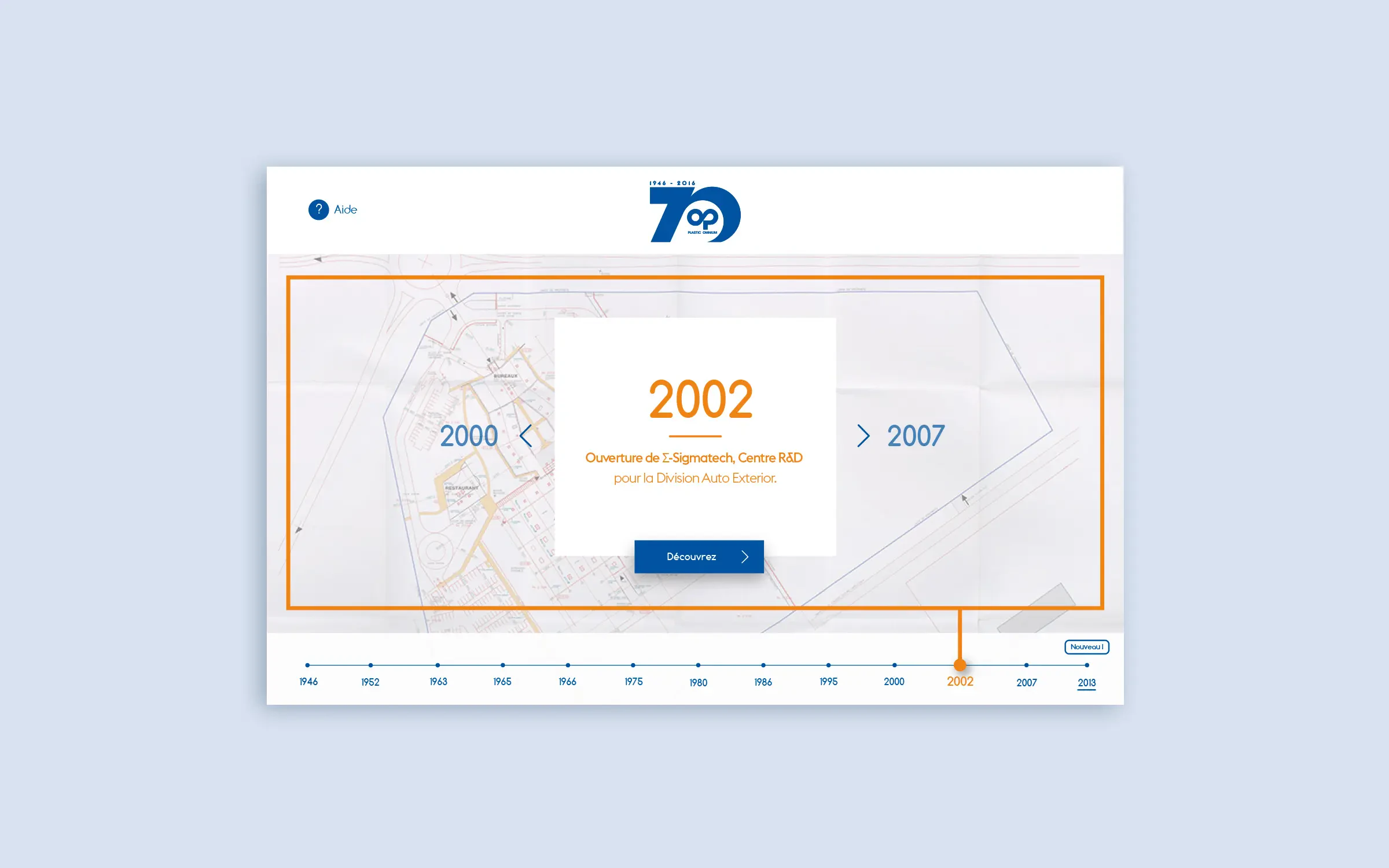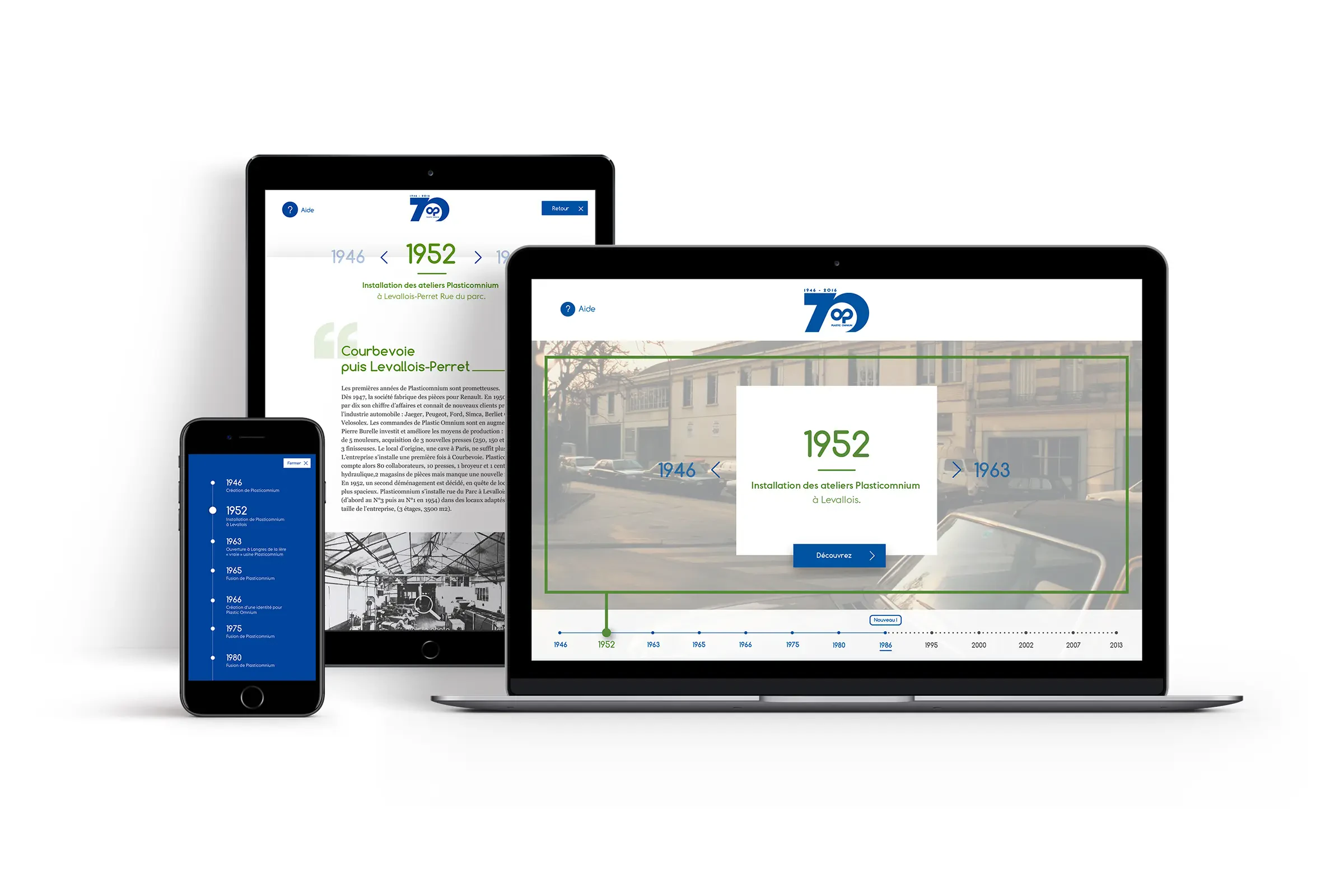 Plastic Omnium est désireux de communiquer en interne sur les 70 ans de la marque et sur son histoire. L’agence 148 développe alors un teaser vidéo afin de communiquer sur cet anniversaire ainsi qu’un site web sous forme de frise chronologique interactive. Cette dernière retrace les moments-clés de la marque. Le résultat est une création qui souligne autant la dimension historique de la marque que sa volonté d’innovation.