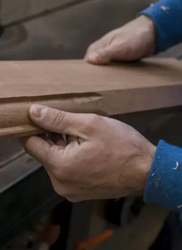 fin de répondre à l’objectif graphique haut de gamme, Gaétan, notre directeur artistique, choisit de mettre l’accent sur les différentes étapes de la fabrication. Sur les mains qui travaillent, sur des outils, sur des copeaux de bois. Au travers des images, l’idée est de montrer la dualité entre la matière brute et la matière travaillée. Et de raconter une histoire : le passage d’un plot de chêne en provenance de la scierie à un meuble, placard, table, bureau.