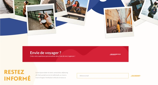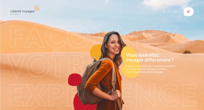 Cette approche d’humain à humain permet également de suggérer au client de Liberté Voyages des ambiances, des thématiques, des univers propres à chaque globe-trotter. Ainsi le voyage n’est plus une simple destination mais bel et bien une expérience sur-mesure. C’est cela que nous avons voulu retranscrire sur la page d’accueil du site.