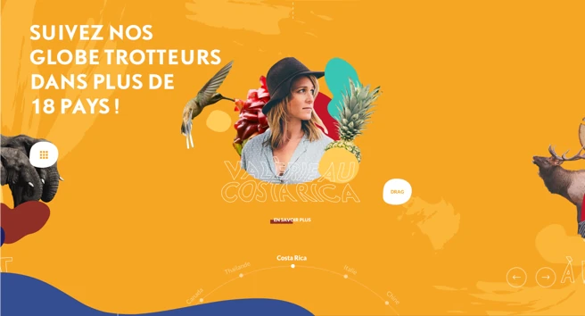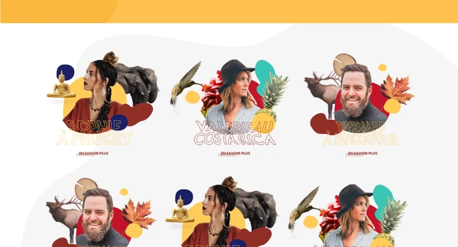 L’UI du site a été pensée de manière à être également une petite expérience. Les titres en plein écran se fondent aux images conçues tels des collages. Un subtil effet de parallaxe ajoute une étape dans l’immersion de l’internaute. La navigation parmi les différents globe-trotters se fait grâce à un système de présentation en arc de cercle, ce qui rend cette sélection dynamique et artistique. Enfin, la disposition des photos à la manière de polaroïds renforce cette idée de site chaleureux, humain, vivant.