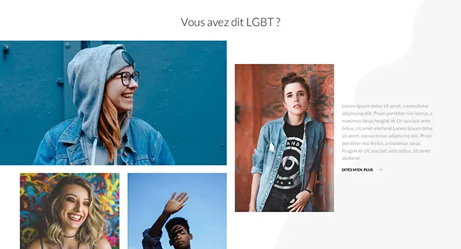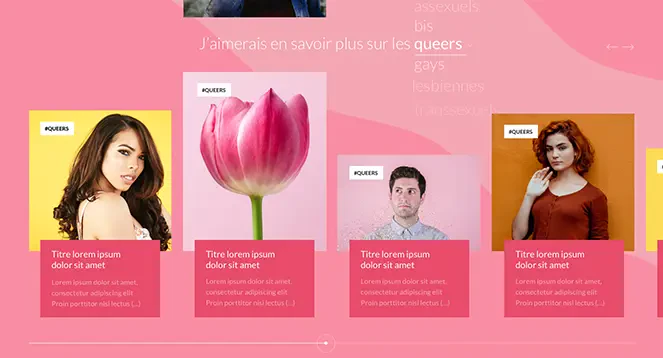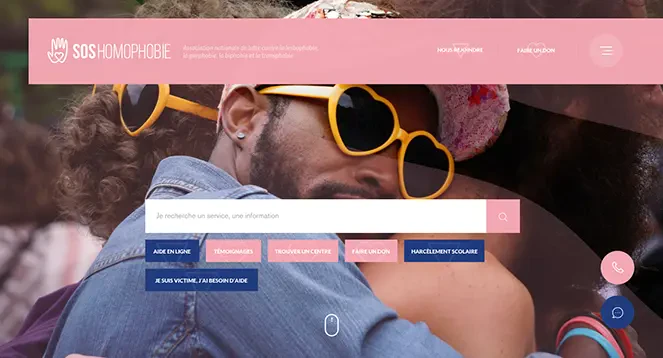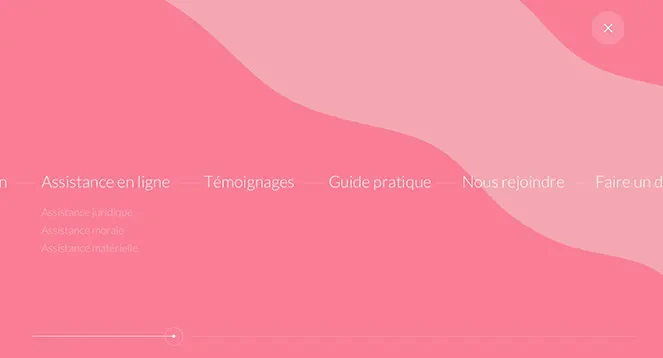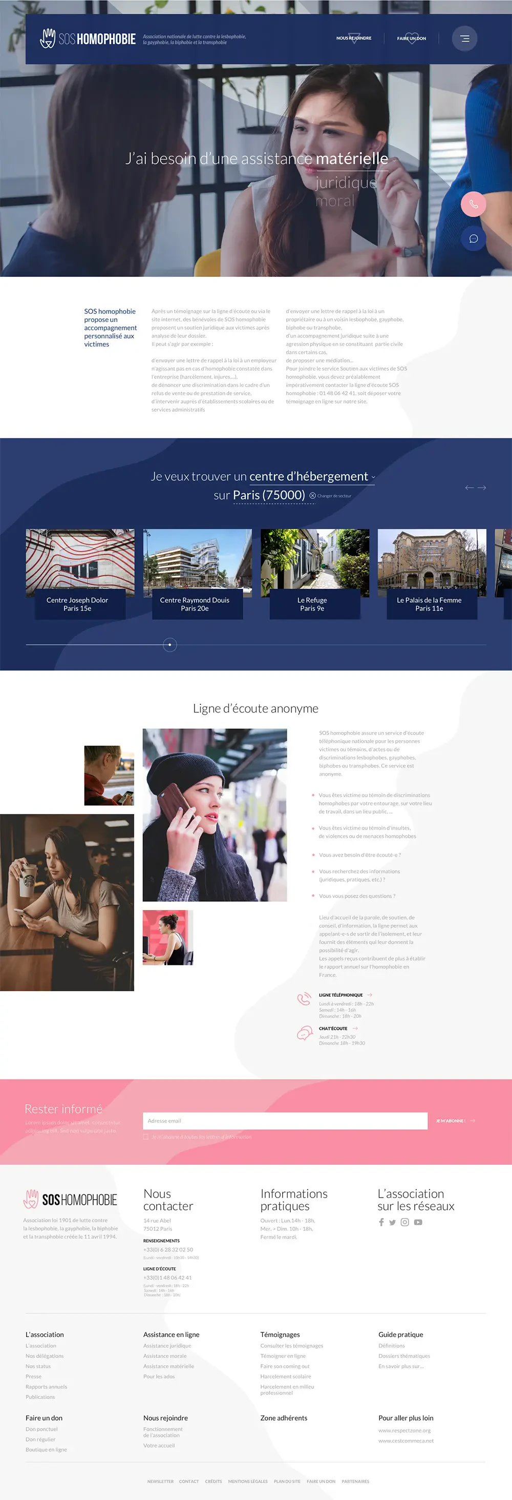Tout comme le logo, le contenu est trié en 2 catégories, d’un côté, en rose, le soutien, le renseignement, l’éducation et de l’autre, en bleu, la lutte, l’assistance, les actions de l’association.