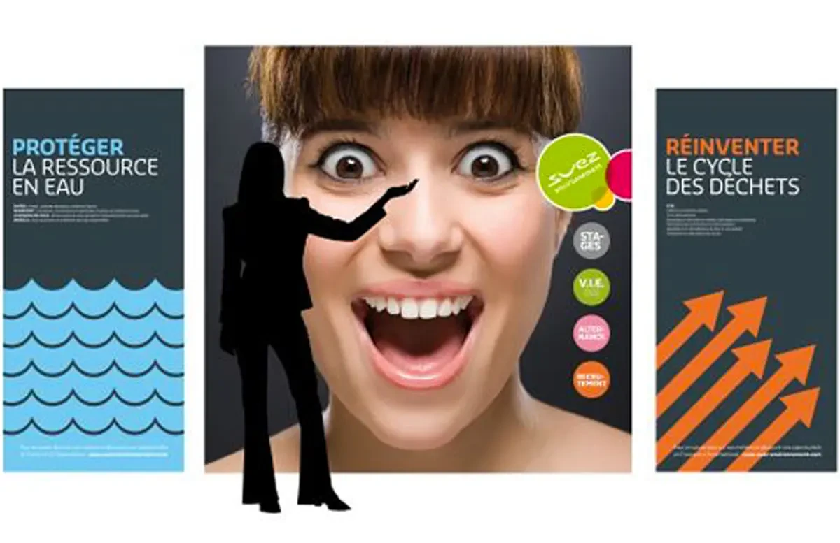 Sur le stand Suez Environnement utilisé dans divers salons étudiants, le dernier visage, le plus expressif, a été repris en panneau d'affichage pour interpeller les visiteurs. La jeune femme avec ses gros yeux chercherait-elle à envoûter les futurs diplômés ? Toujours est-il que cette demoiselle avait pour but d'interpeller, de susciter un questionnement... auquel les collaborateurs de SUEZ ENVIRONNEMENT, beaucoup plus sereins, se sont faits une joie de répondre !