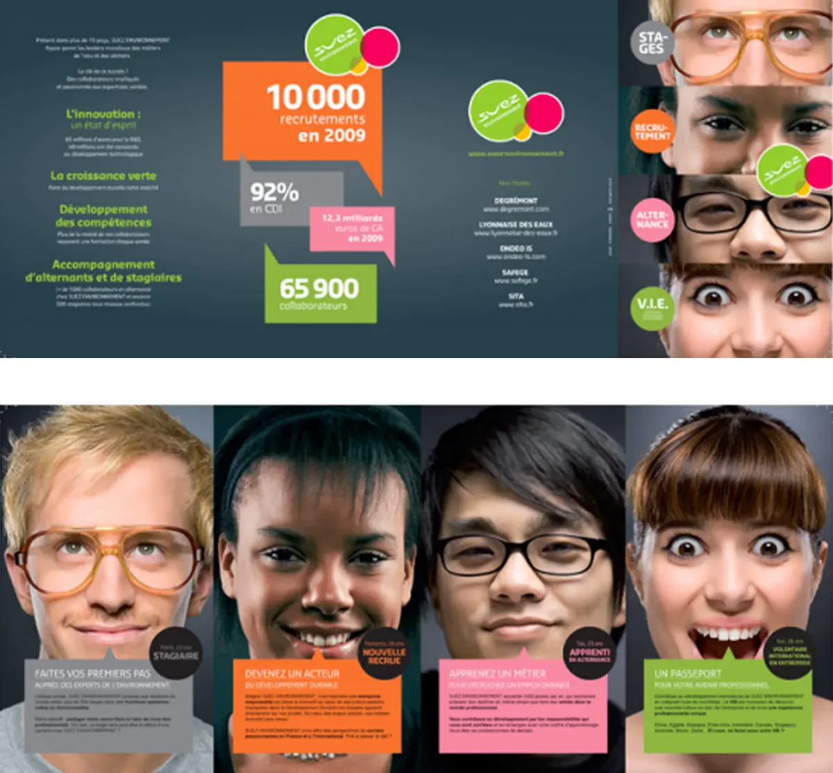 Pour le dépliant : une proximité immédiate avec les principaux visés, représentés dans leur plus grand ensemble. Des chiffres chocs et des explications claires et succinctes sur les nombreuses perspectives d'évolution chez Suez Environnement. De la même manière, les développeurs de l'agence ont travaillé un autre dépliant, moins imagé et plus formel, basé principalement sur l'information concernant les différentes possibilités de carrière chez Suez. Des couleurs à la fois sobres et pêchues, des chiffres et des mots-clés savamment ajustés, le message essentiel est lisible de suite.