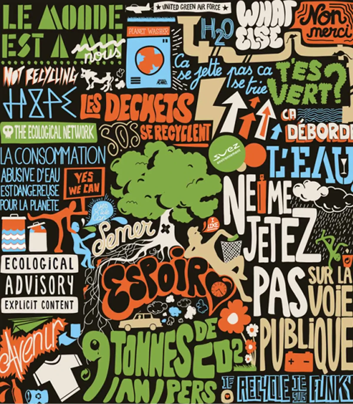 Suite à cette collaboration, SUEZ ENVIRONNEMENT nous a demandé de créer un t-shirt. Nous leur conseillons de ne pas faire un t-shirt simple "porte logo" et d’avoir une réflexion autour du message et surtout donner la chance à celui qui le porte de ne pas lui réserver une place de fond de tiroir pour les jours de travaux ou de peinture !