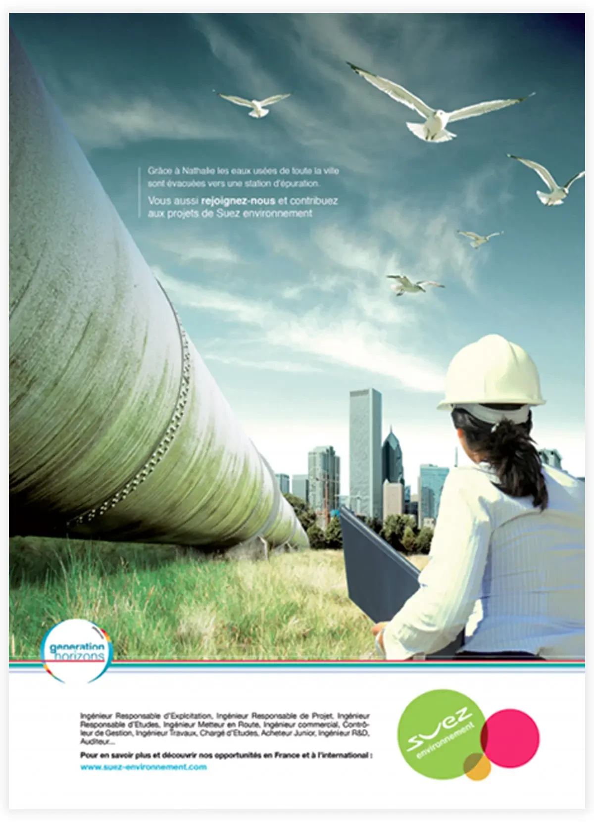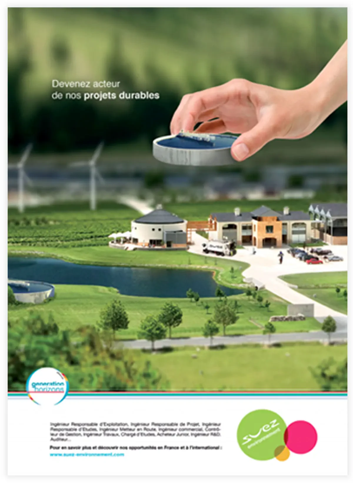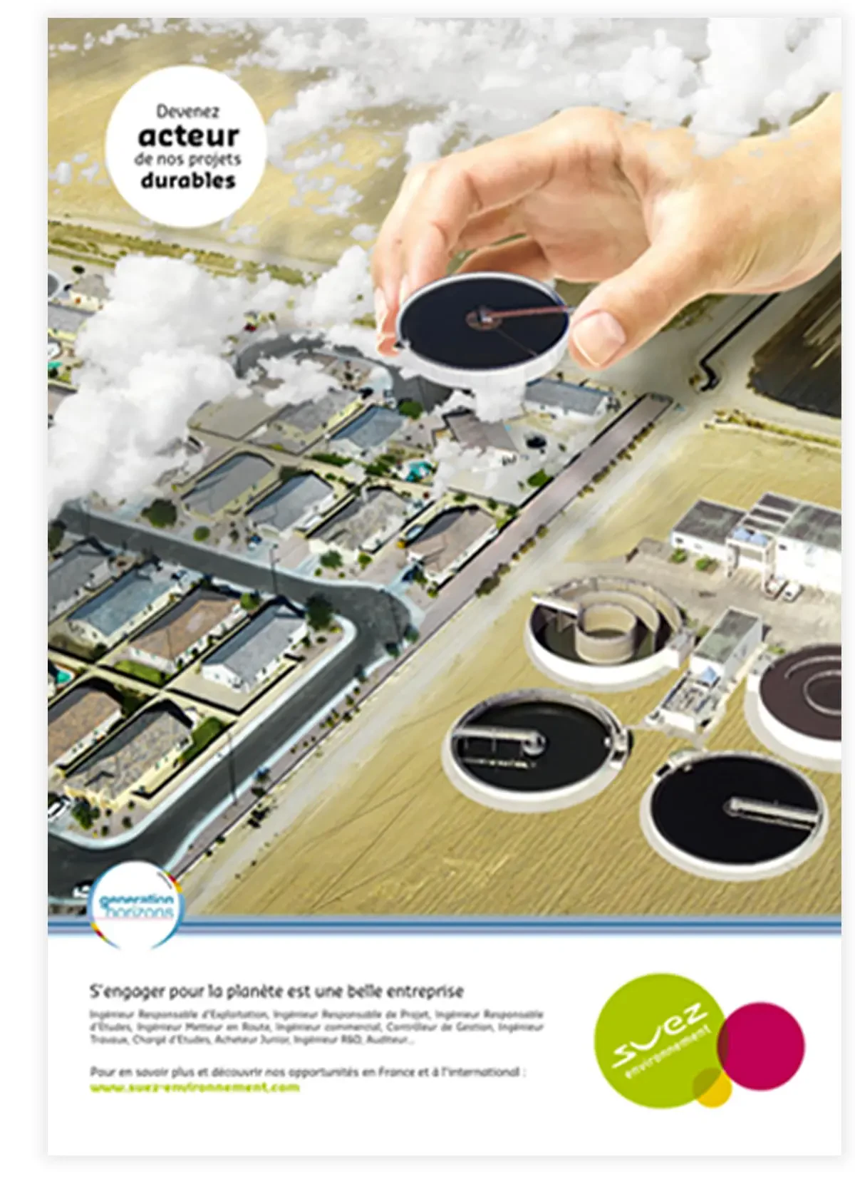 La Direction des Ressources Humaines a donc fait appel à 148 pour moderniser ses visuels destinés aux jeunes travailleurs. Publiés sur des supports de presse généraliste ou des annuaires étudiants, ils doivent les séduire instinctivement tout en délivrant un message concret : votre avenir est ici ! Parallèlement, Suez Environnement a également souhaité la réalisation d'un petit fascicule de présentation des chiffres clés du groupe et des diverses opportunités qu'il offre aux jeunes.