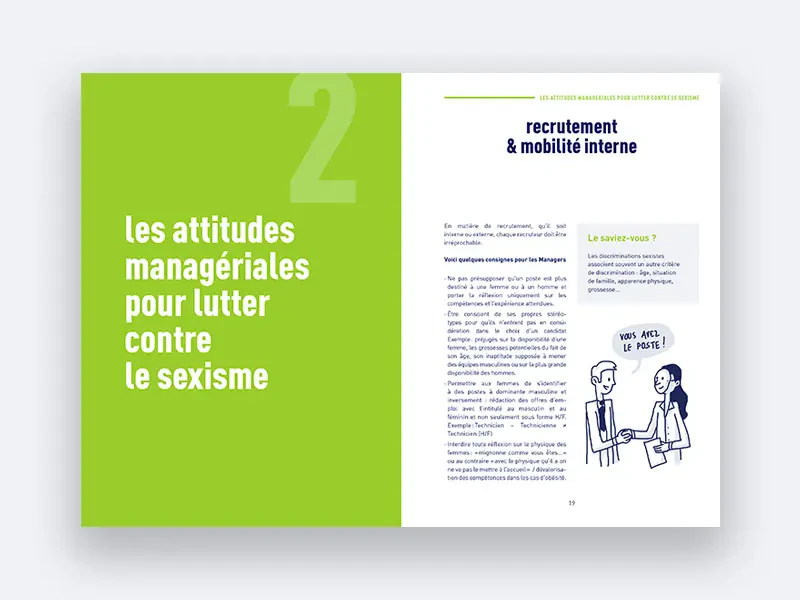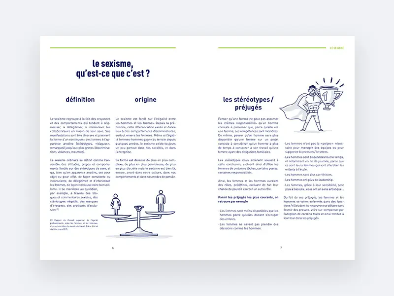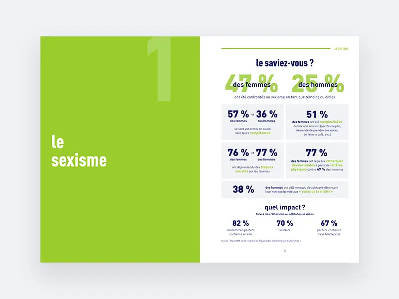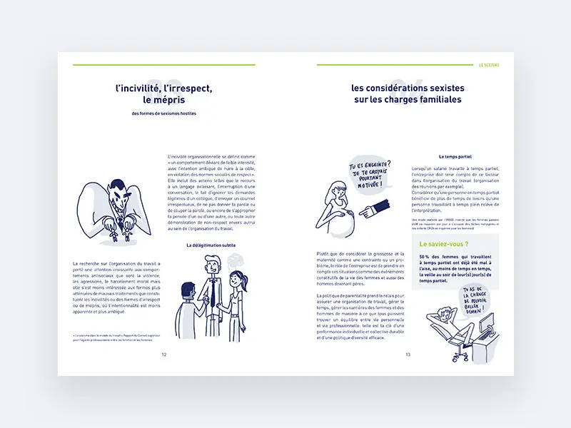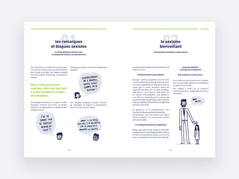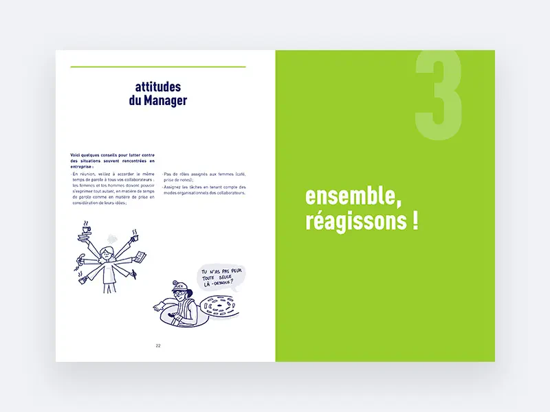 SUEZ souhaite distribuer à ses salariés une brochure pour sensibiliser sur le sexisme ordinaire. Sur ces petites phrases qui sont régulièrement prononcées dans les bureaux et qui n’ont l’air de rien, qui peuvent même faire rire les collègues, mais qui sont dégradantes. On est très heureux d’avoir été choisi pour élaborer ce guide de 18 pages. 148 Agence Collective est B Corp et, à ce titre, nous nous engageons sur ces questions d’égalité et de respect de l’autre.