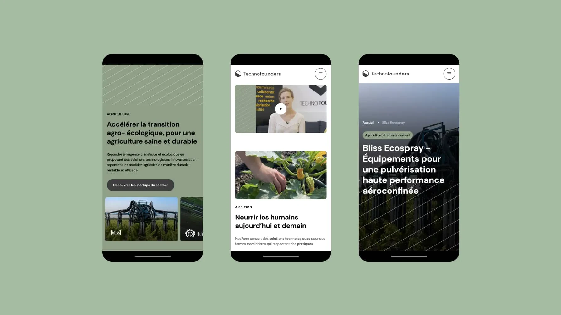 Côté graphisme, le logo doit être préservé, ça fait partie du brief. Mais Lisa, notre directrice de création, fait valoir les faiblesses de l’identité : un rayon de ruche vu et revu, une couleur jaune difficile à utiliser en web et qui ne peut pas servir à identifier les domaines d’expertises de Technofounders, des images sous-exploitées… Soit. 148 Agence Collective propose un lifting du logo, et surtout un système graphique cohérent : le logo sert de forme pour insérer des photographies, et un système de couleurs et de formes issues des mathématiques identifie d’un coup d'œil les expertises. Et si Technofounders se lance dans un nouveau domaine ? 148 Agence Collective pourra ajouter une “rubrique” graphique !