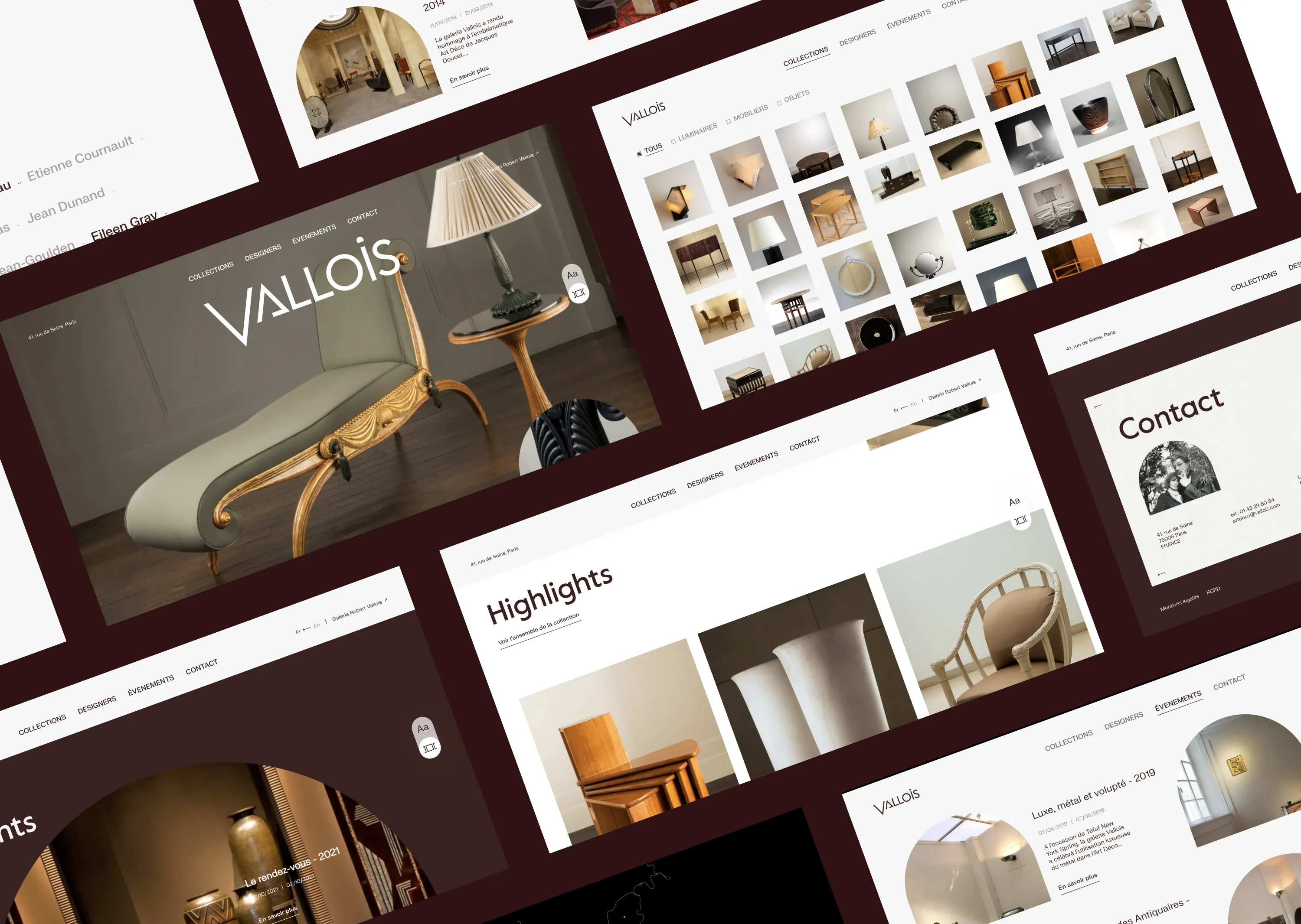 Vallois, c’est aussi un projet qui évolue au fur et à mesure de nos échanges avec le client : rapidement, on propose de travailler les deux spécialités de la galerie de manière distincte, en séparant le site consacré à l’Art déco de celui dédié à l’art contemporain. On fait également valoir l’intérêt d’accompagner cette refonte de site par un travail sur le logo, qui datait alors des années 30.